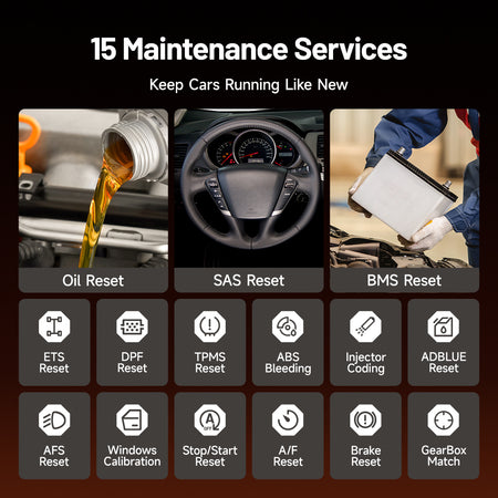- From oil resets to gearbox matching, this scanner integrates 15 maintenance functions to comprehensively care for your vehicle. Whether it's routine maintenance like resetting the oil light and bleeding the brakes, or advanced operations like calibrating windows and matching the gearbox, you can easily handle and keep vehicle stays in top condition.