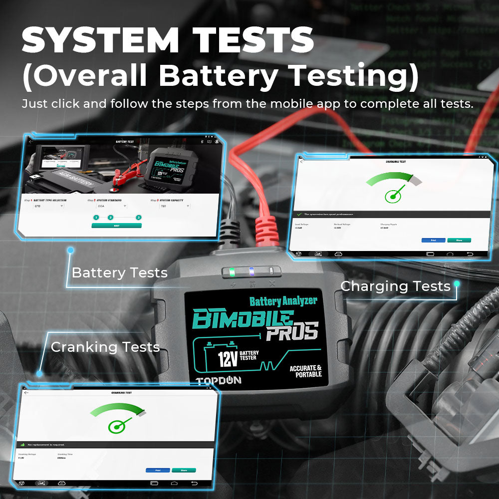 BTMobile ProS is TOPDON®’s latest Battery Analyzer. It works on 12V batteries within the 100-2000 CCA. It also meets CCA, BCI, CA, MCA, JIS, DIN, IEC, EN, SAE, and GB battery specifications. It uses cutting-edge conductivity detection technology to pinpoint bad 12V battery cells. It outputs easy-to-understand information about the vehicle battery health, the alternator's charging, and the starter's cranking conditions. The built-in Ultra Safe function can protect against short circuits, reverse polarity, and over-voltage that allow it to connect to any battery safely.