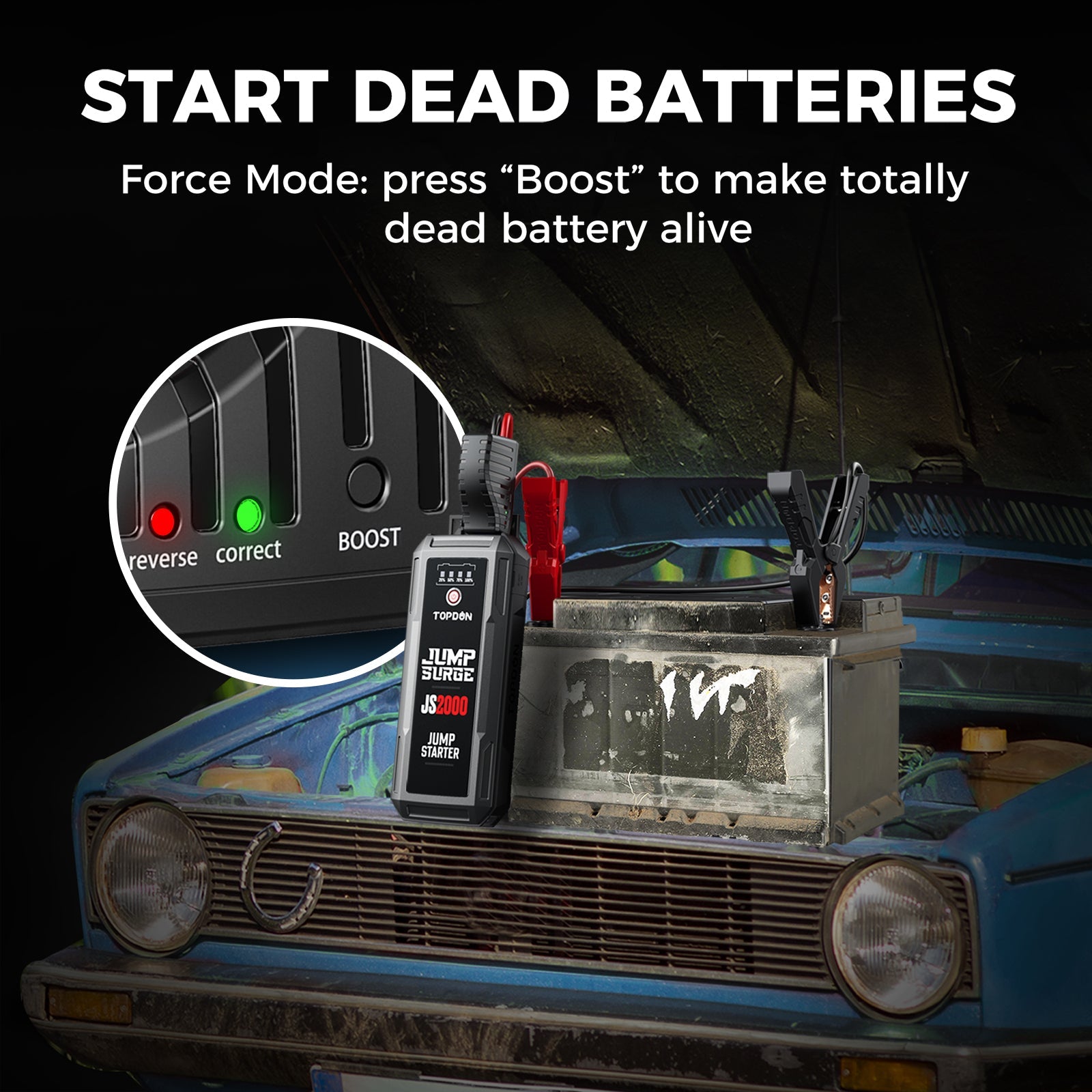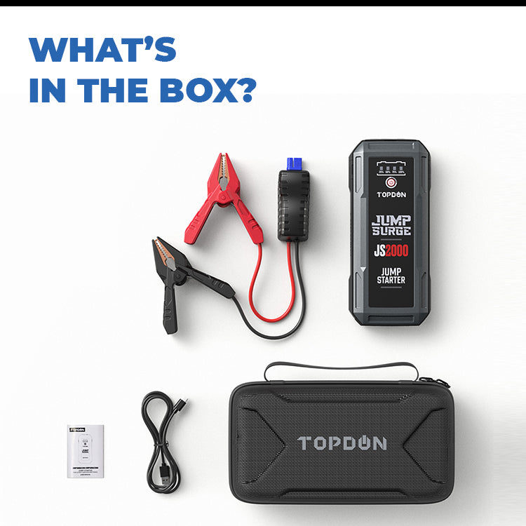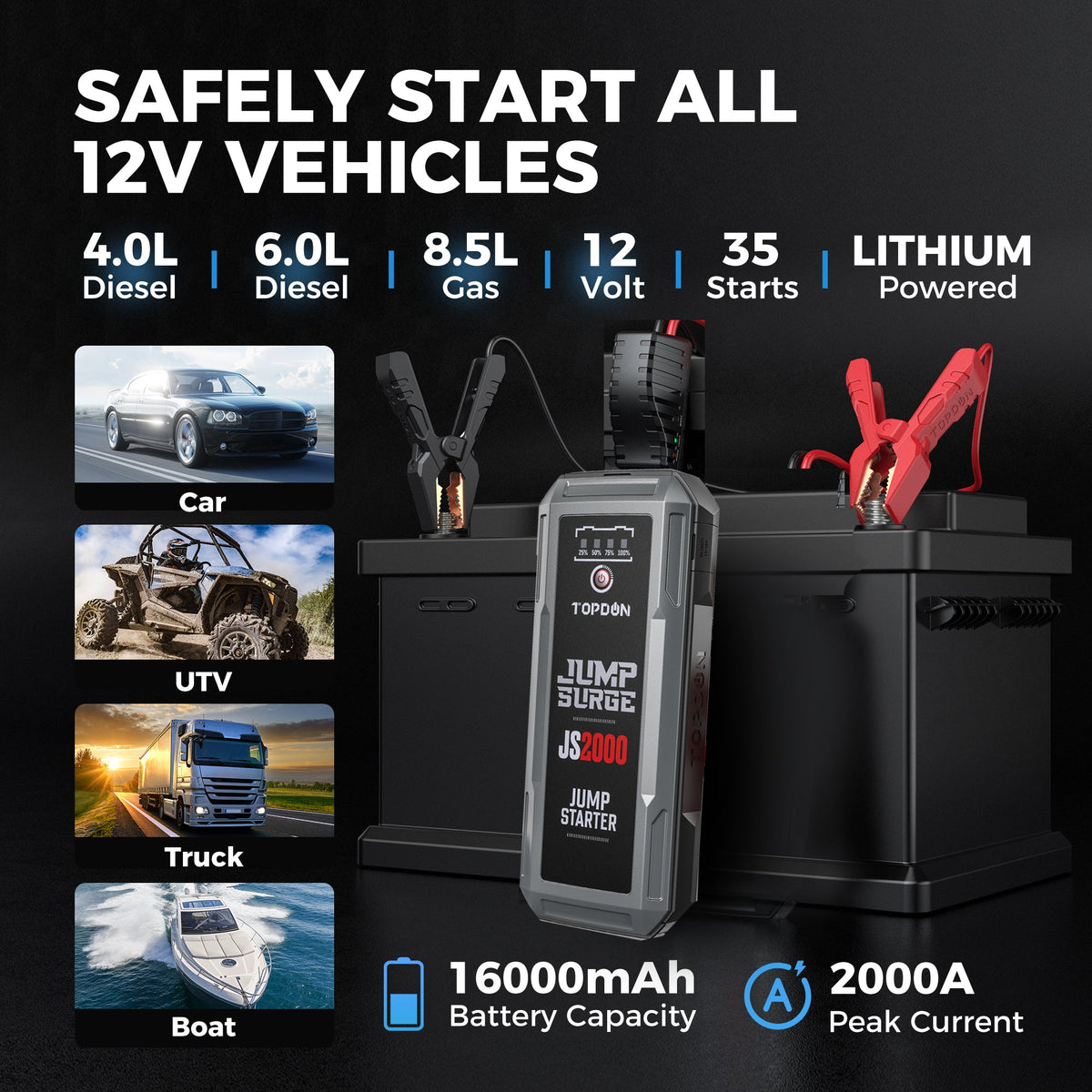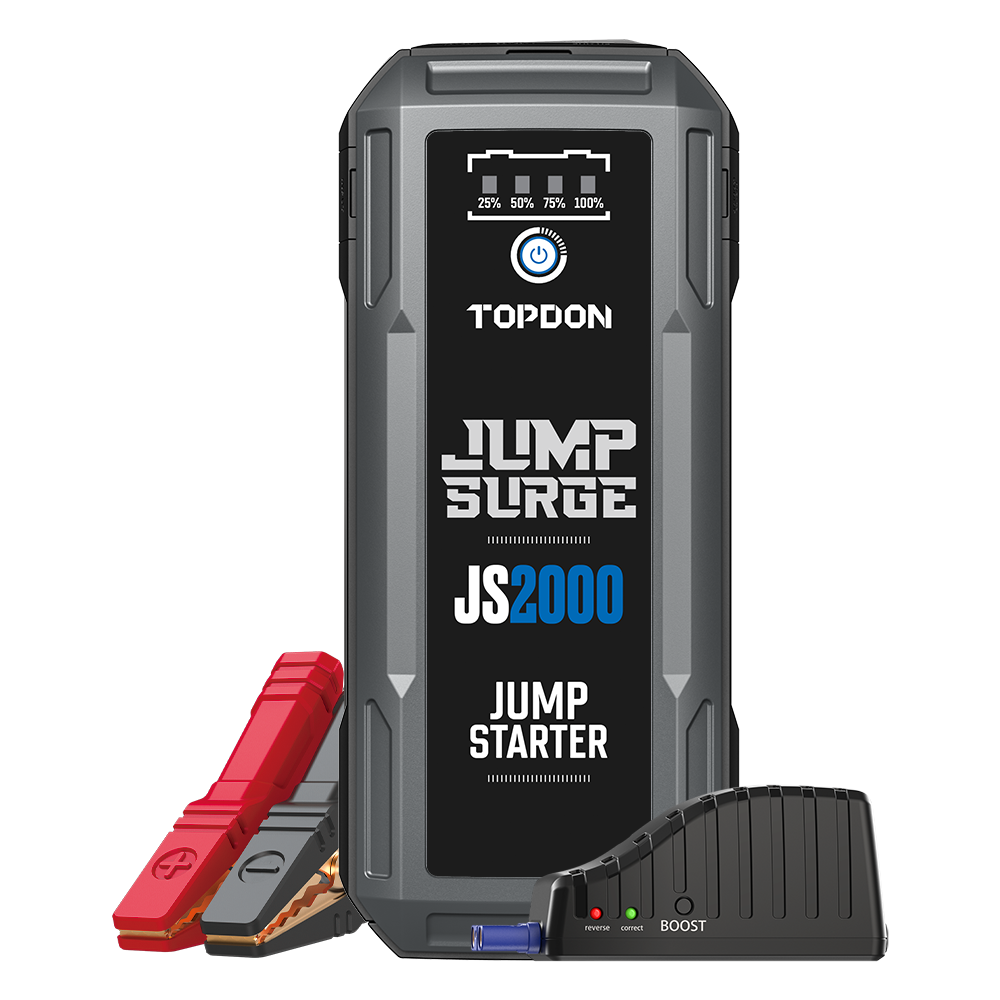 The JumpSurge2000(JS2000) is a 2000 Peak Amp jump-starter and power bank for cars, trucks, boats, motorcycles, and more. This device supports vehicles with 12V batteries on gas engines (up to 8L) and on diesel engines (up to 6L). This tool features multi-protection for extra-safety and charges your devices faster than a standard charger.