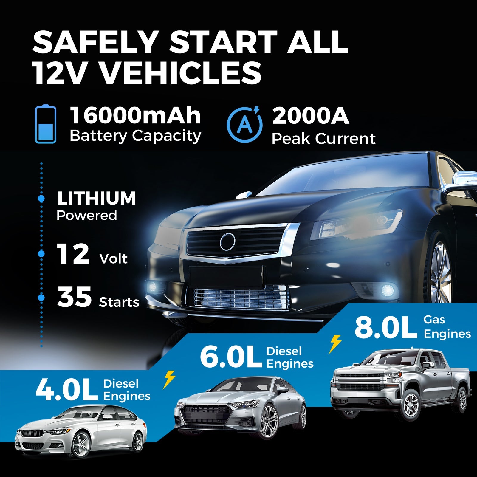 - 16000 mAh battery capacity. Jump 35 times on a single charge!