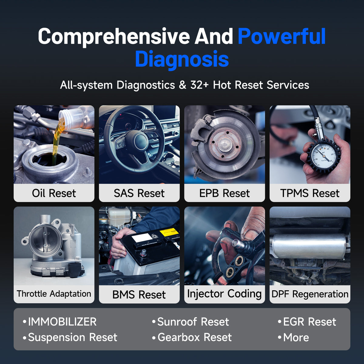 - Unlock 32 common services such as Oil reset, EPB reset, SAS reset, ABS bleeding and DPF for mainstream vehicle models, to enhance the Phoenix Nano’s utility in routine maintenance and extend the lifespan of vehicle components for improving driving experience.
