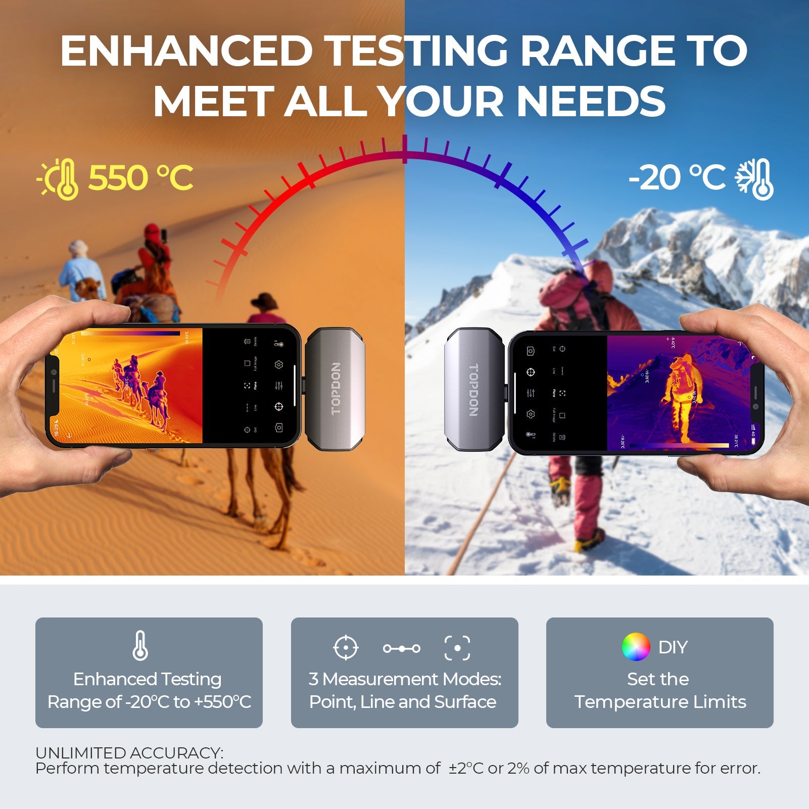 - The TC002 boasts a wide temperature range of -4°F to 1022°F (-20°C to 550°C), making it suitable for temperature readings on a variety of objects. It also boasts serious accuracy, with a maximum deviation of ±3.6°F (2°C) or 2% of the actual temperature, and a temperature measurement resolution of 0.1°F (0.1°C).