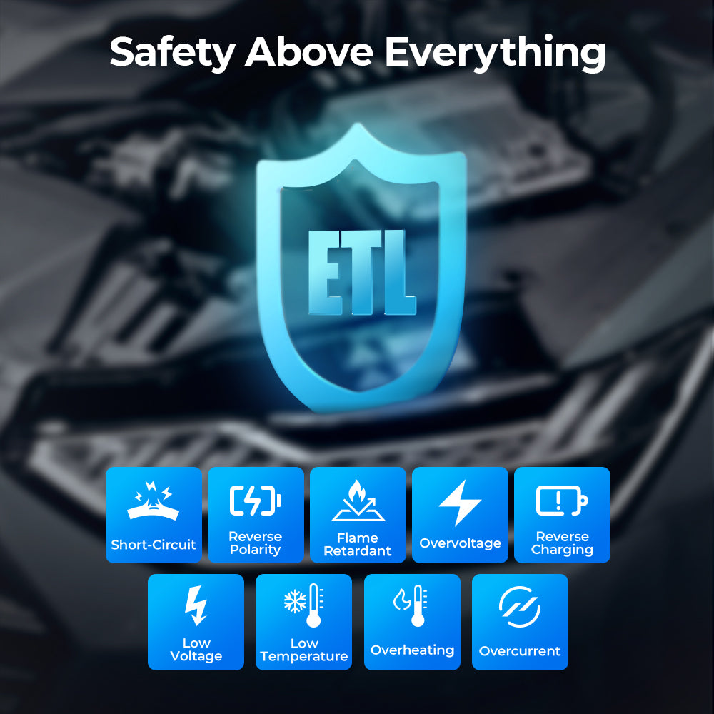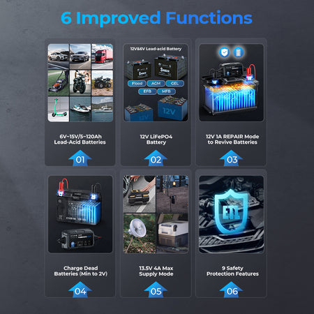 The Tornado4000 supports a wide selection of batteries ranging from 5Ah to 120Ah, compatible with all types of 6V & 12V lead-acid batteries, and 12V lithium batteries including LI, AGM, WET, GEL, MF, CAL, EFB. - 5 Charging Mode