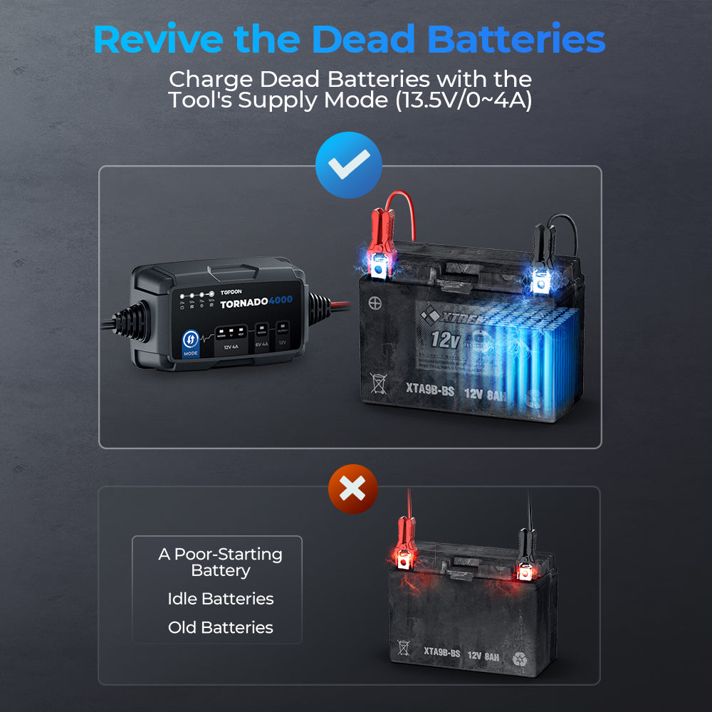 - TOPDON’s patented 9-step smart charging gives your lead-acid battery an optimized, maintained, and integrated charging process. When connected, not only will the Tornado4000 charge the battery, but it will act as battery maintainer to truly repair your car battery. Moreover, the Tornado4000 specializes in offering a 5-step smart charging mode for lithium batteries.