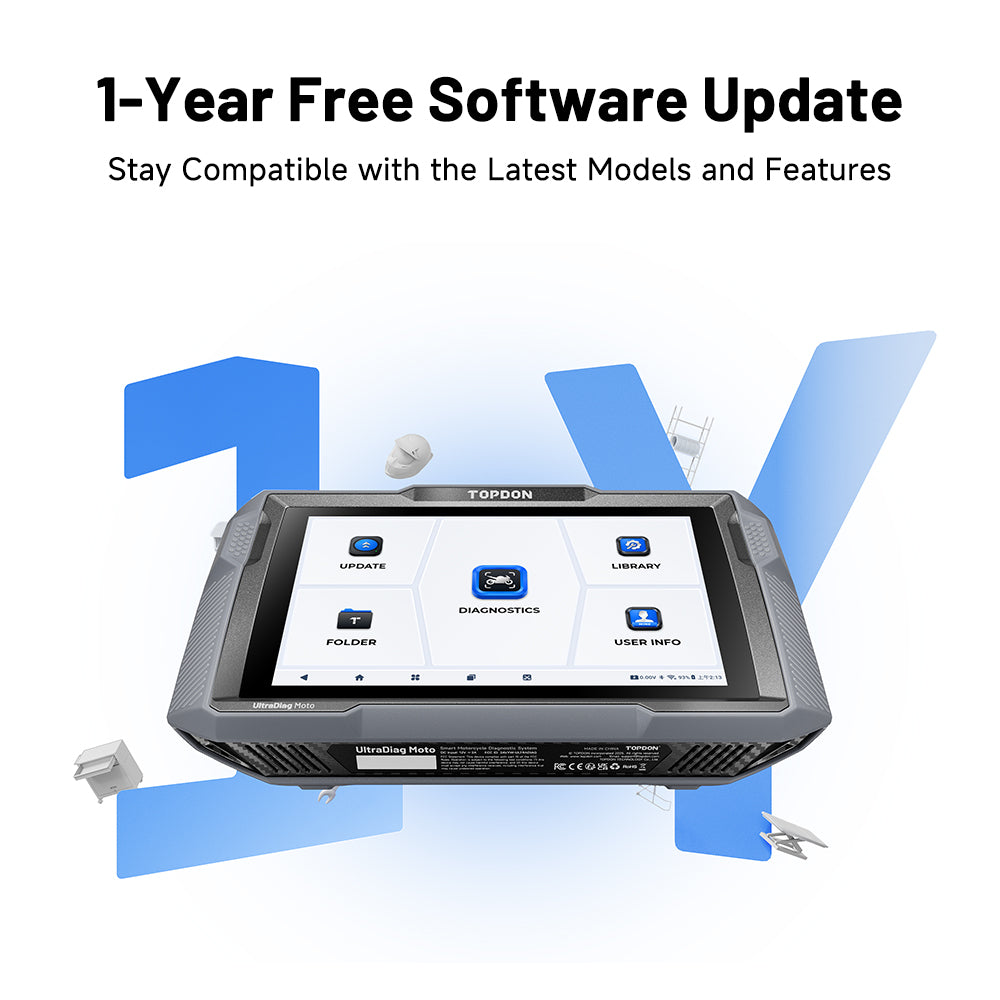 - Enjoy a full year of free software updates, keeping your UltraDiag Moto compatible with the latest motorcycle models and enhanced diagnostic features. With one-click WiFi functionality, the upgrade process is seamless, enabling you to tackle repair challenges while maximizing your return on investment.