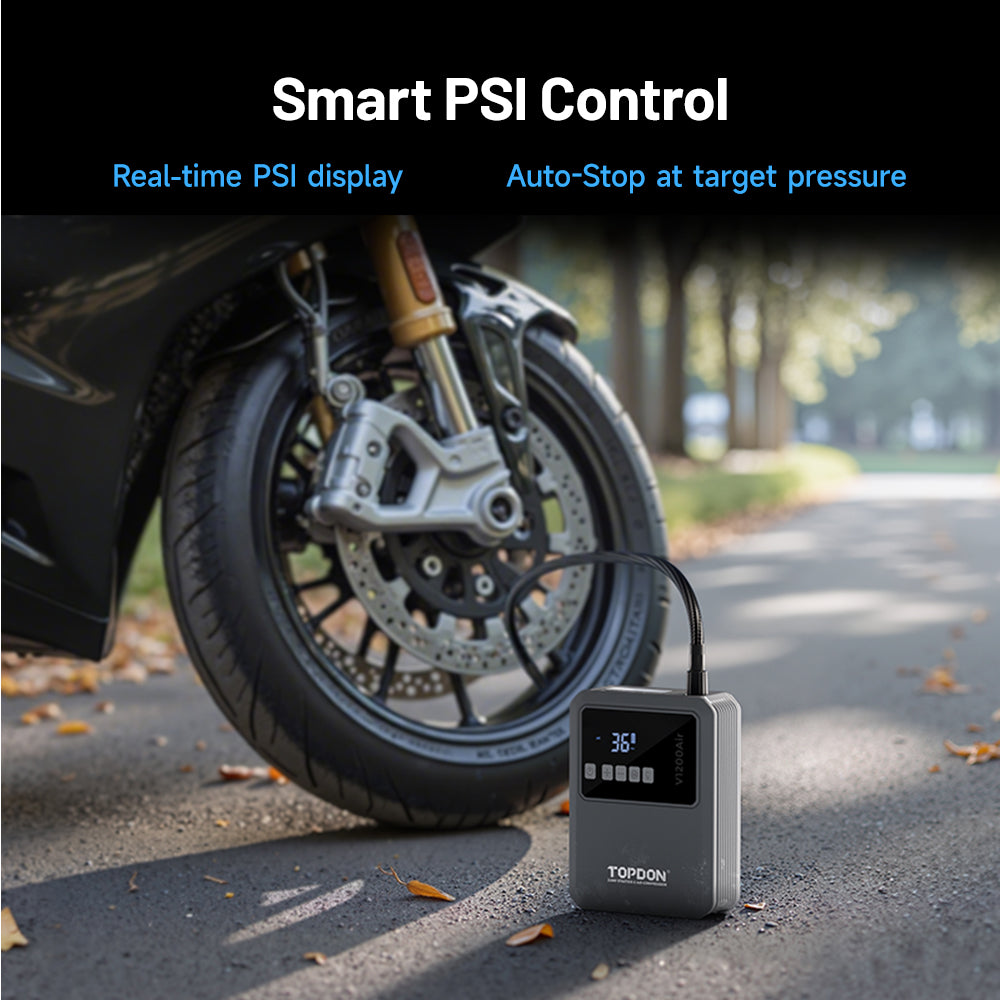- V1200Air detects real-time tire pressure, letting you proactively monitor PSI levels during routine checks or mid-emergency inflations. See live updates to avoid underinflation—which causes handling issues and uneven wear—or overinflation, which risks dangerous blowouts. Simply set your target pressure, and the Auto-Stop instantly halts inflation when reached—effortless safety for all.