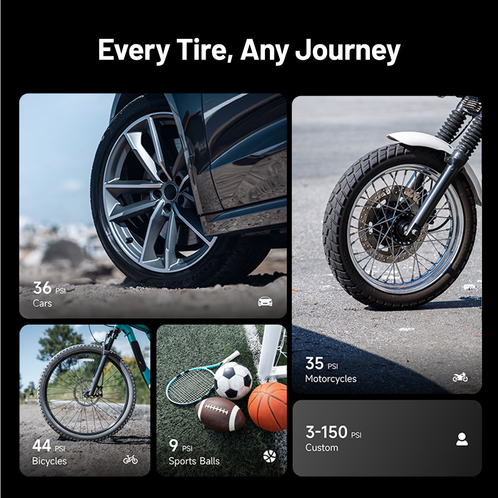 - One device, infinite inflation. With a versatile 3–150 PSI range, the V1200 Air powers almost everything from daily vehicles to sports gear and adventure equipment. Instantly switch between preset modes—Car, Motorcycle, Bike, Ball—or create custom settings for unique needs. Smart Dry-Run Detection halts operation in 1 minute if unused, preventing energy waste and motor damage. Wherever your journey takes you, stay ready.