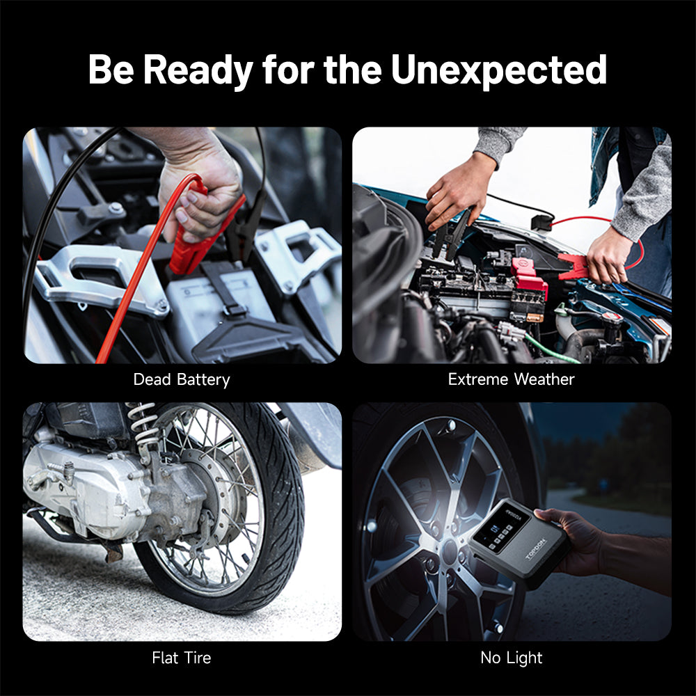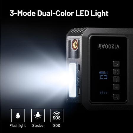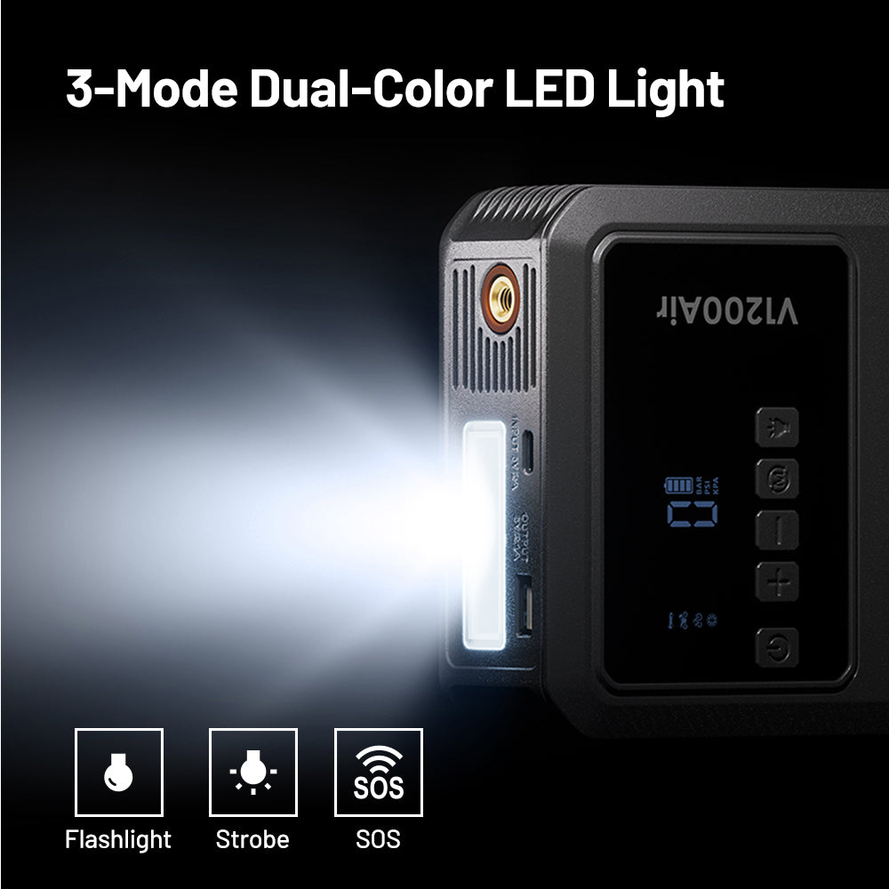 Meet your lightweight (2.6 lbs), toolbox-friendly roadside companion. This portable powerhouse delivers a 1200A peak current, capable of jump-starting 12V cars, motorcycles, boats, and fleets with up to 6.0L gasoline or 4.5L diesel engines. It also features 5 smart inflation modes for quickly and easily inflating tires. Equipped with 5-layer safety protection and a bright 3-mode LED light, the V1200Air offers versatile power and dependable peace of mind wherever you travel.