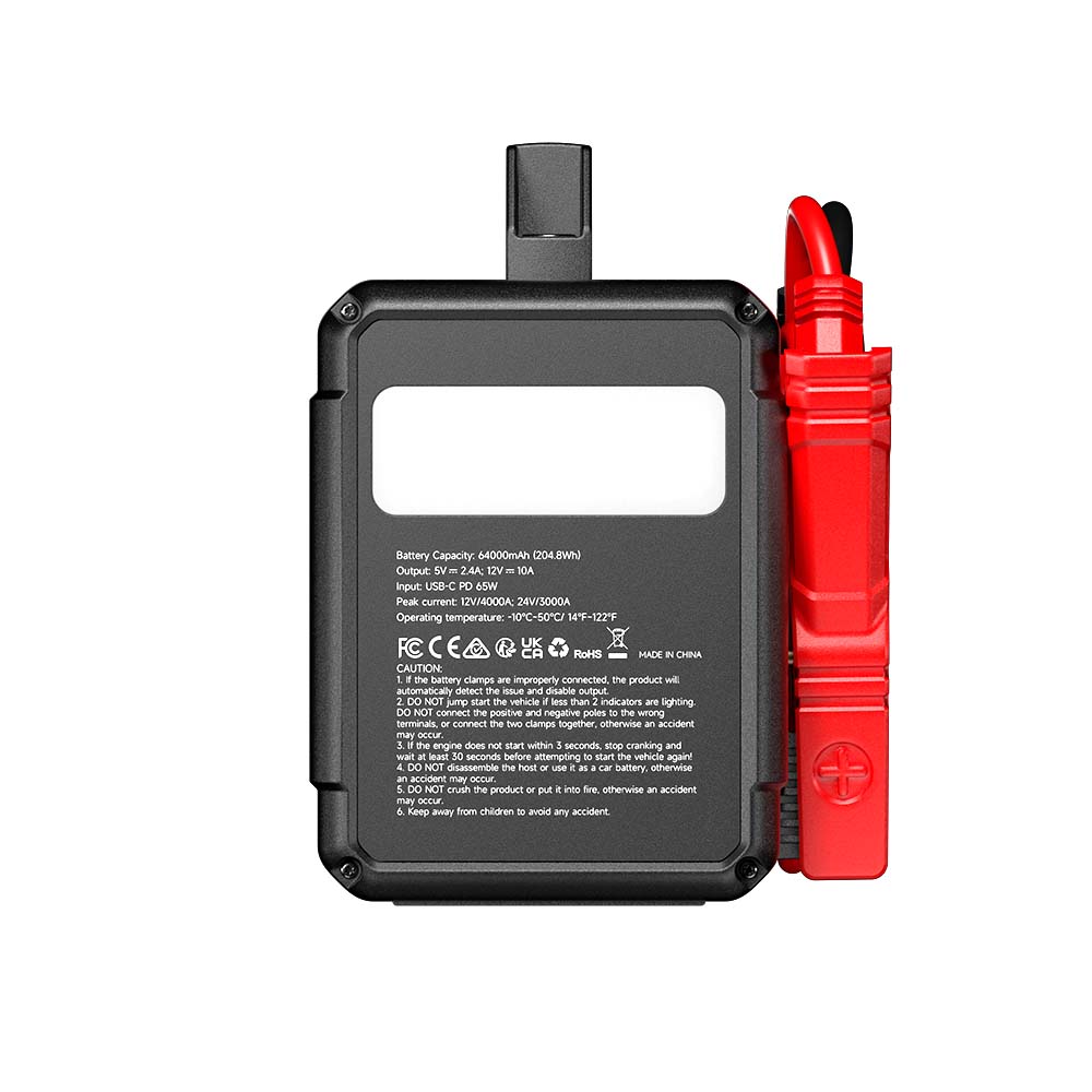 The V4000 HD is a professional-grade jump starter built to handle the toughest jobs. Designed for both 12V and 24V systems, it brings drained batteries back to life in everything from passenger cars to heavy-duty trucks and buses. With up to 4,000A of peak current, a rugged 64,000mAh LiFePO₄ battery, and 7 layers of protection, the V4000 HD delivers dependable power wherever it's needed. Fleets, shops, and roadside pros trust the V4000 HD to start fast and stay ready.